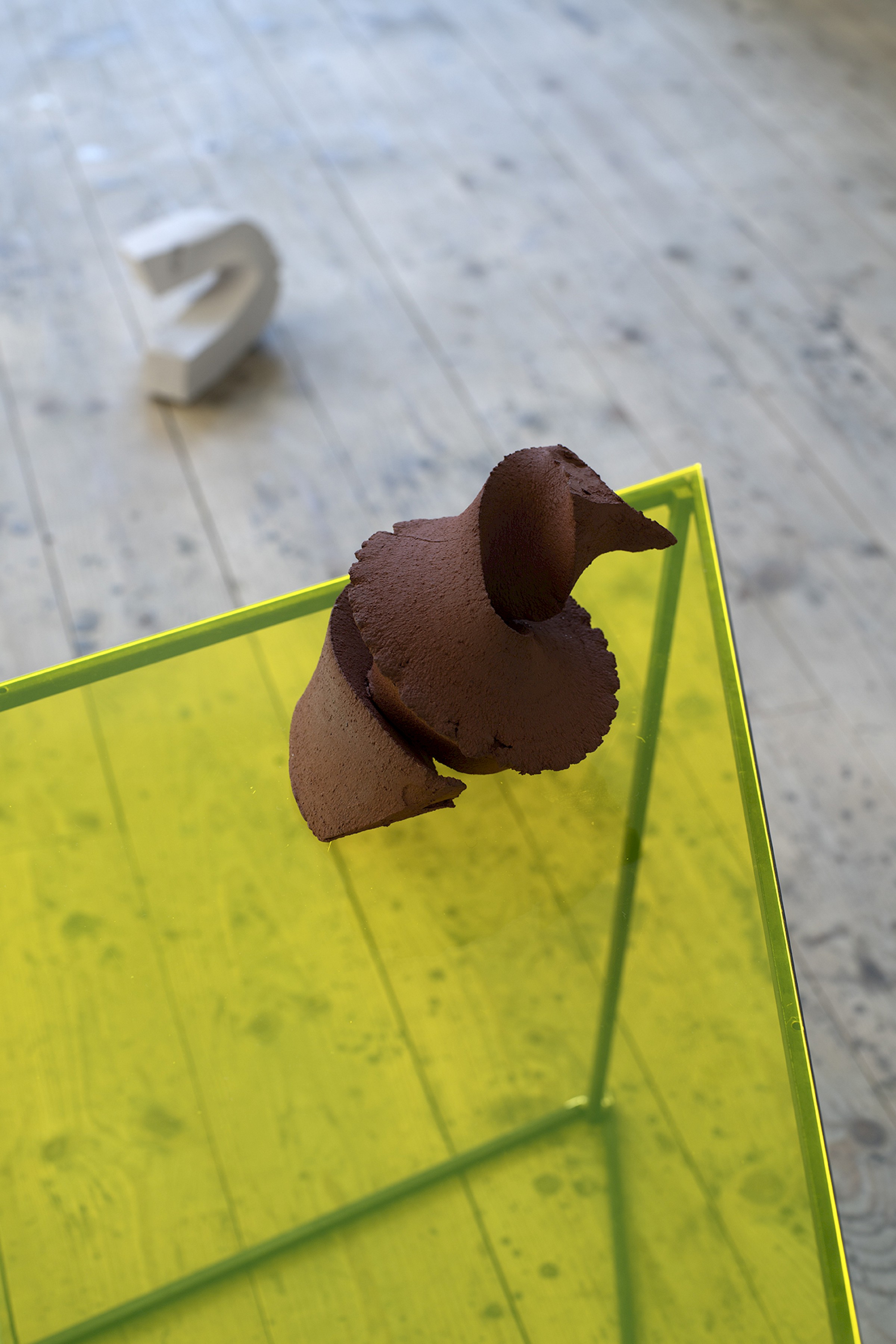 Modelle für eine Beseelung is about the relation we build to the objects around us and the degree of animation we project into them in order to identify with them. The three-dimensional objects get their shape by pressing different earth substrates through two-dimensional templates. The different colours of the models stem from the earth substrates being used.
