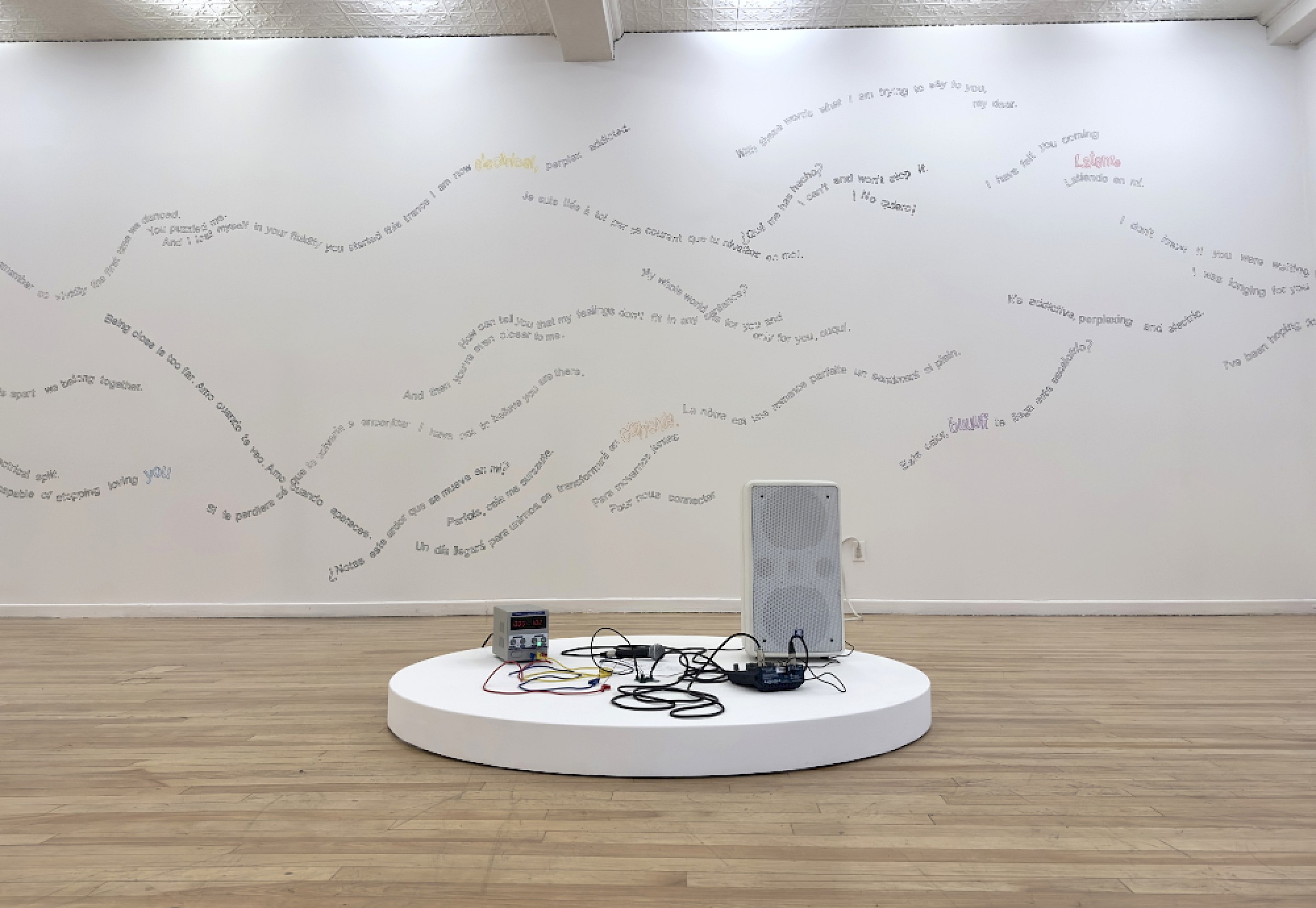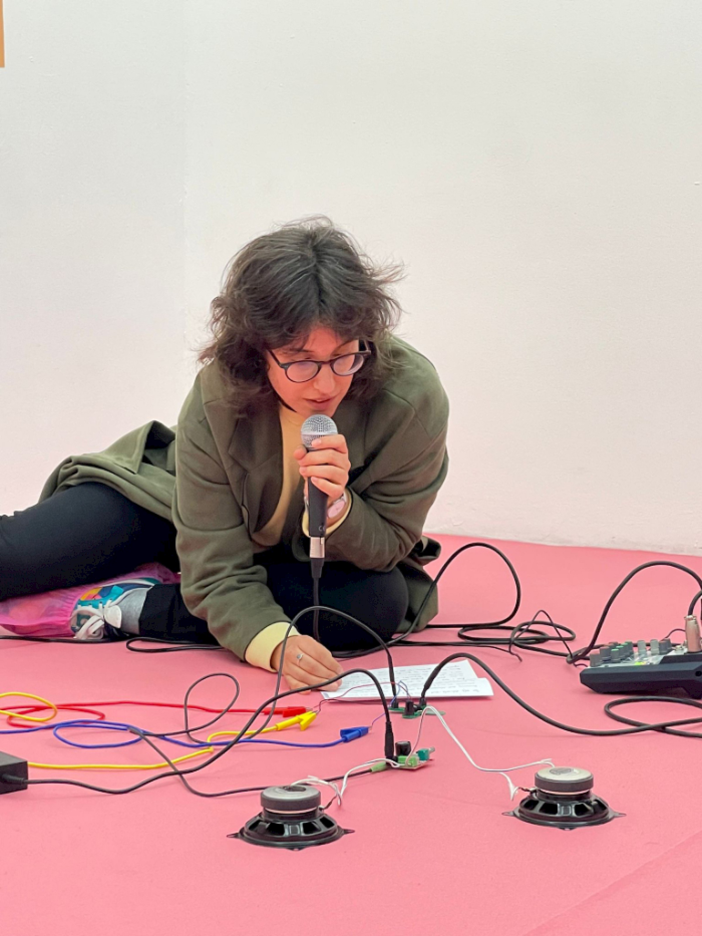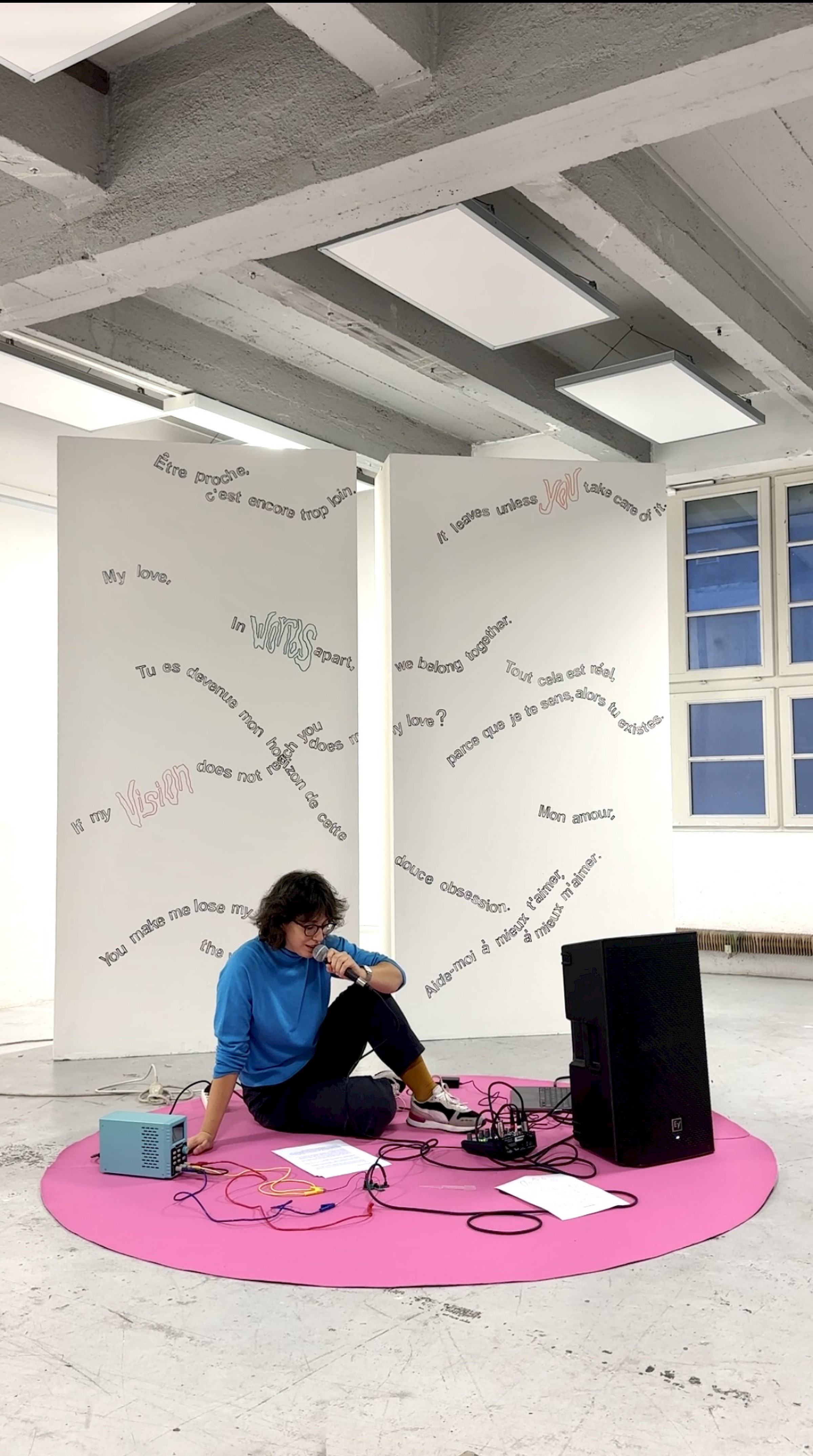 Let's Symbiose and Be With is an installation and performance with cable bacteria, which are capable of transmitting electricity and have revolutionized the conception of the origin of life because until now the conductive capacity of bacteria was not considered. The work consist of a series of love letter addressed to and transmitted by the cable bacteria, so the audio signal of the microphone is conducted through the bacteria until it reaches the speakers.